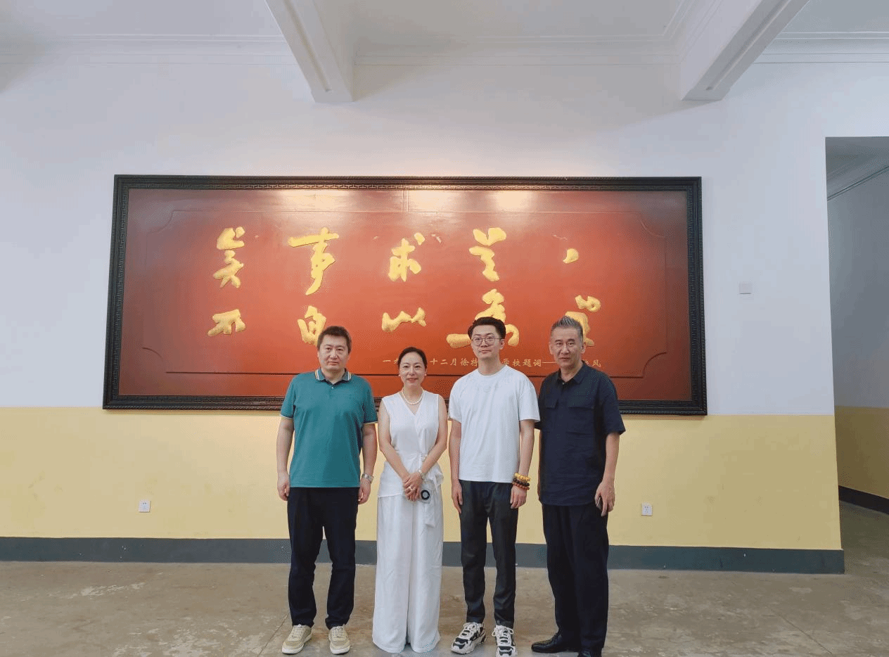 聂岩、杨丹、徐翰禹、王晖(从左至右)在徐特立先生题写的校风“实事求是,不自以为是”横匾前合影